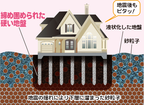 これは、天然の砕石(石の粒)を地中に押し固めて地盤を強くする方法です。