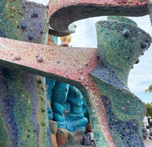 お城の壁面には砕かれたカラフルなタイルが貼られていて、