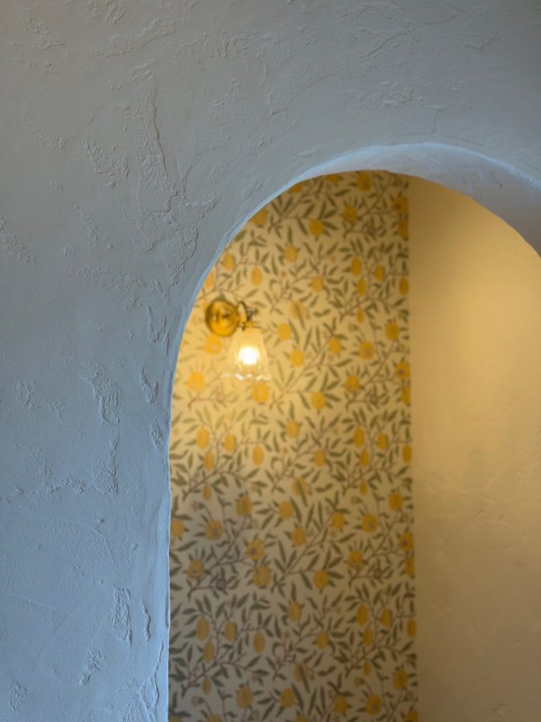 塗り壁のアーチ越しの壁紙が印象的で空間のアクセントになっていました!