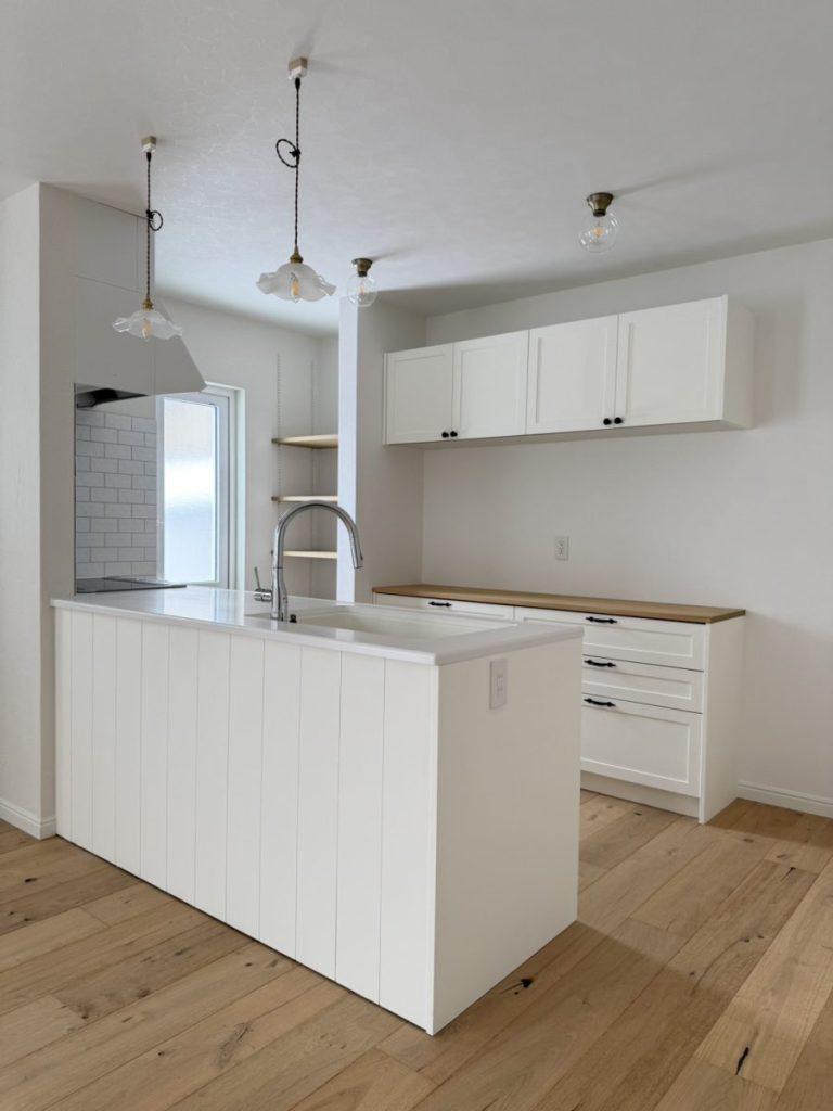 対面キッチンも立上りの壁をなくしてフラットな仕上がりに!