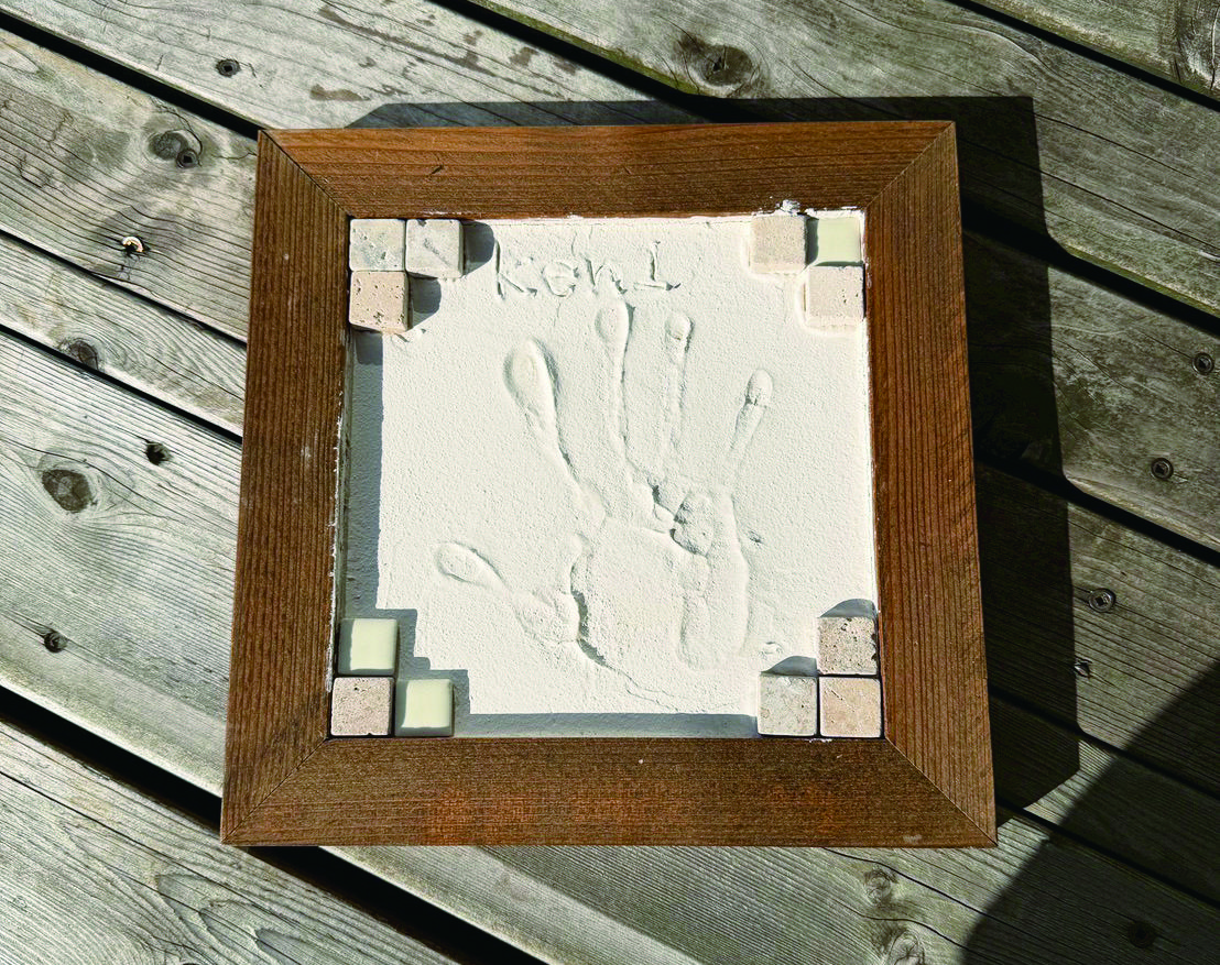 木製フレームに塗り壁を塗って、手形と飾り付けを施すアート体験です