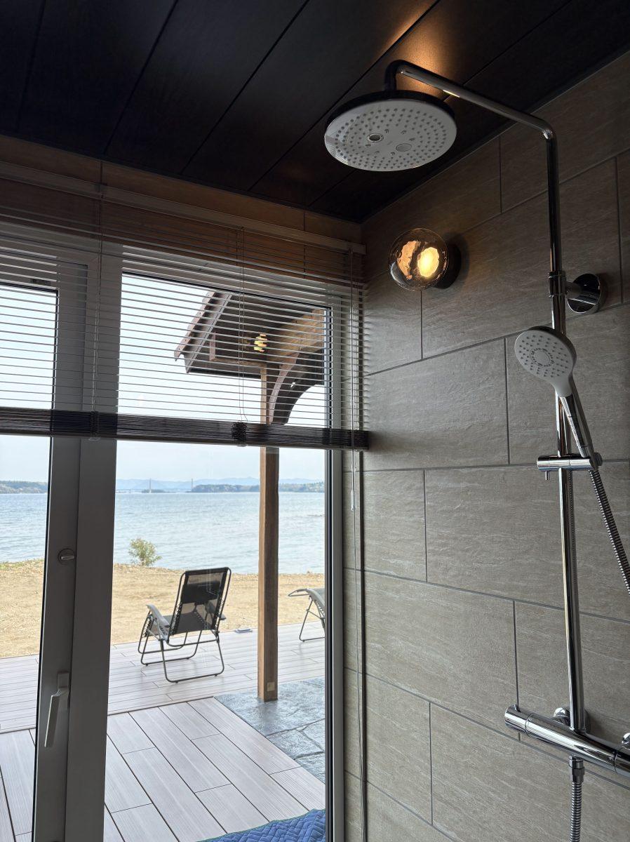 ガラス張りのバスルームは海での疲れを癒す上質な空間に。