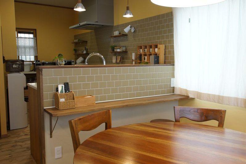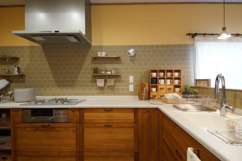 木の質感を活かしたキッチンはやわらかな色味のタイルを組み合わせ、