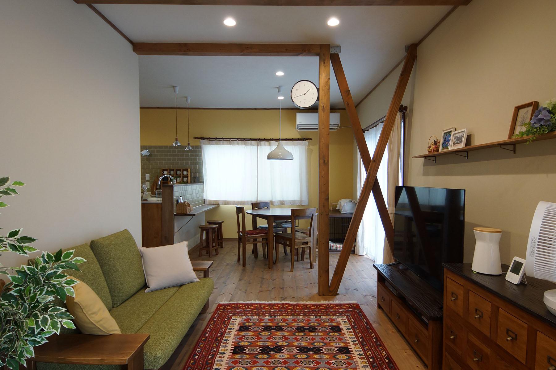 筋交いがアクセントとなり、付け梁とともに木のぬくもりを感じます。