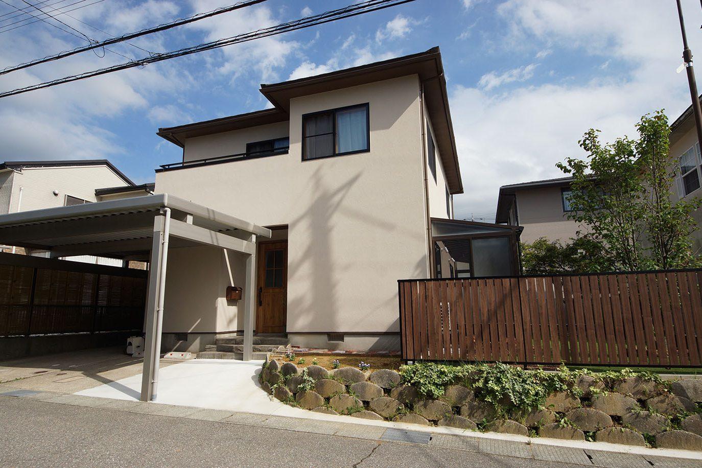 外壁の塗り壁と調和し、住まい全体にやわらかく温かみのある印象を与えています。